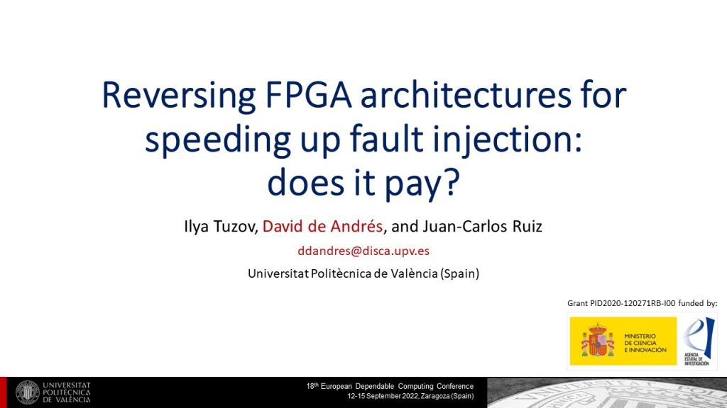David de Andrés has presented the paper entitled “Reversing FPGA architectures for speeding up fault injection: does it pay?” authored by Ilya Tuzov, David de Andrés and Juan-Carlos Ruiz at 18th European Dependable Computing Conference (EDCC 2022).